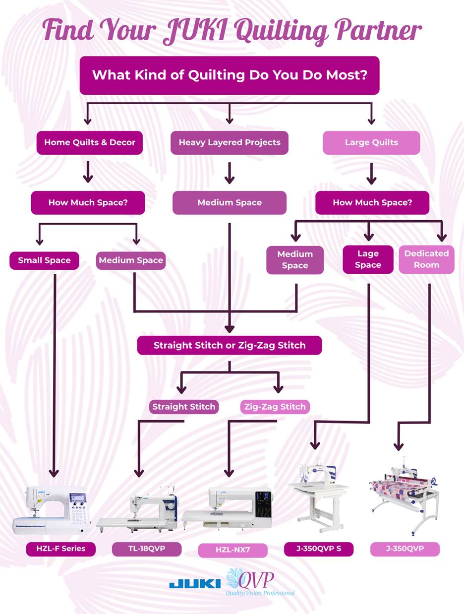 We hope our chart can guide you, but the real decision happens when you sit down at the machine! Visiting a JUKI dealer or attending a JUKI event gives you the chance to test different setups, feel how they handle, and see which one matches your quilting style. Join us this year at our upcoming shows to experience JUKI and find your dream machine! You can visit us here to learn more about upcoming events, or click here to find a JUKI dealer and test a JUKI machine sooner. Happy Quilting!