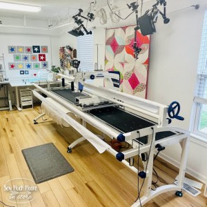 For finishing my quilts, I rely on my JUKI Miyabi J-350QVP longarm, set up on a 12-foot frame. This machine has been a game-changer for me. With its precision and ease of use, I can complete my quilts with the level of detail and quality that I expect. But what truly sets my setup apart is the automation package. This allows me to multitask in ways I never thought possible. While my longarm is quilting in the background, I can be at my sewing machine piecing another quilt—maximizing my productivity without compromising quality.