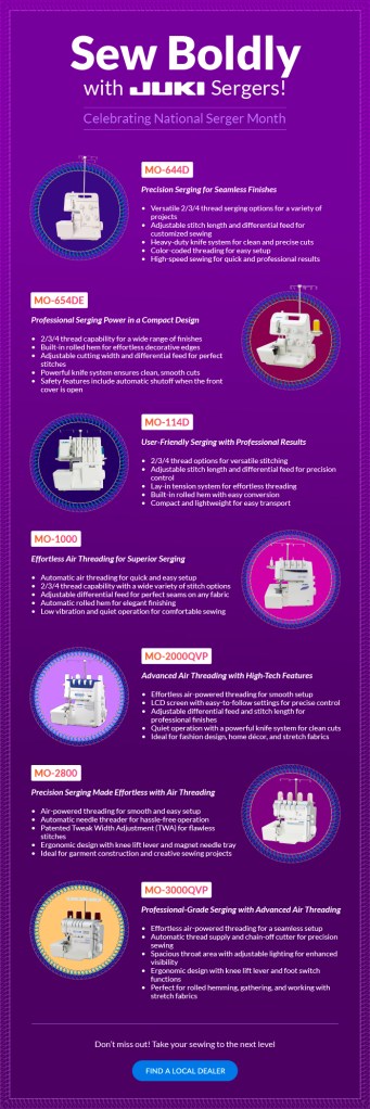 Whether you’re upgrading your serger, investing in a bundle, or treating yourself to a top-of-the-line machine, JUKI has something to support your summer sewing goals. Each offer is available for a limited time through participating dealers.