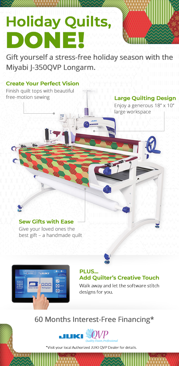 Get your holiday quilts DONE! Give yourself a stress-free holiday season with the Miyabi J-350QVP.