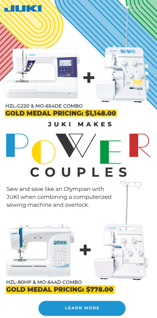 This month at JUKI we’re introducing the Power Couples! With these two machines working together expect to make finished products that look professionally done! Find our HZL-G220 and MO-654DE, as well as our HZL-80HP-A and MO-644D combo at a dealer near you. Sew and save like an Olympian on this Gold Medal offer we have.!