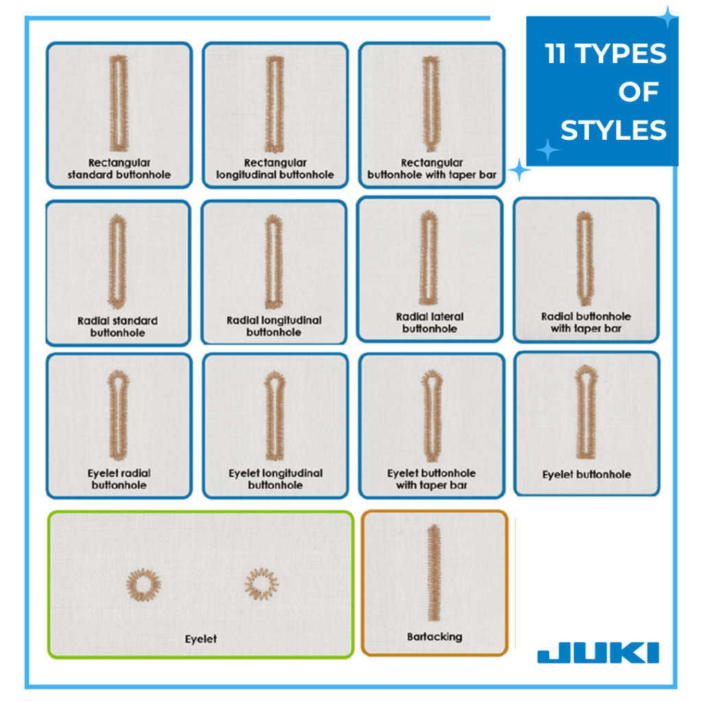 Coming soon, the EB-1 is an innovative computerized buttonholer tailored for semi-industrial sewing machines. Unparalleled in the industry, this accessory stands out with its 11 pre-set buttonhole patterns complete with bartack and eyelet functionality. The bartacking stitch proves versatile, accommodating tasks like pocket corner sewing, zipper end reinforcement, and belt loop attachment. Meanwhile, the eyelet function serves both functional and decorative purposes, allowing string passage and enhancing clothing aesthetics.