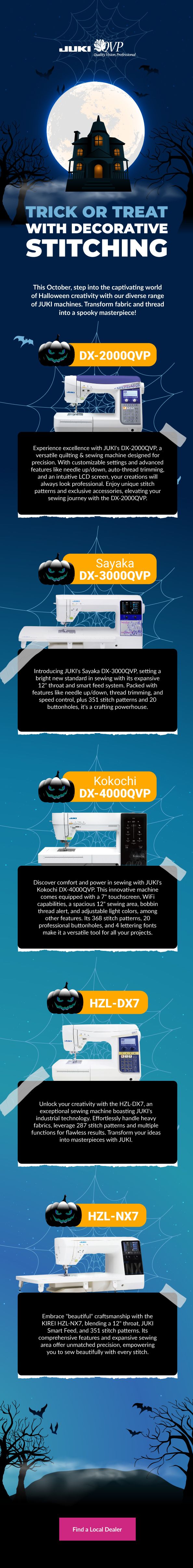 Get ready to add a touch of enchantment to your Halloween sewing projects with JUKI! Our DX and HZL series machines are the ultimate companions for sewists and quilters looking to bring their Halloween costume ideas to life. With a wide array of decorative stitches and innovative features, these machines will transform your creative visions into reality. Whether you’re stitching intricate spiderwebs onto a witch’s cloak or crafting spooky embroidery for a ghostly gown, the DX and HZL series ensures precision and ease.