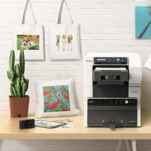Last, we have the RICOH Ri 100 Printer, which is perfect for small businesses interested in fabric printing. The RICOH comes in a compact design and offers an easy-to-use interface, which makes it accessible for beginners! This machine offers the ability to print high-quality images on textiles and opens up opportunities for custom t-shirts, tote bags, banners, and more. For startups, the RICOH’s efficiency and affordability compared to other garment printers in the market will allow you to experiment with creative ideas and expand your product range without significant overhead costs!